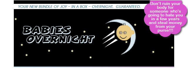 It doesn't have to be this way. At babiesovernight.com, you pick the kind of baby you want and have it delivered the next day. No cord to cut, no morning sickness, no having to stop drinking and smoking, no post-birth vagina that looks like a wind tunnel.