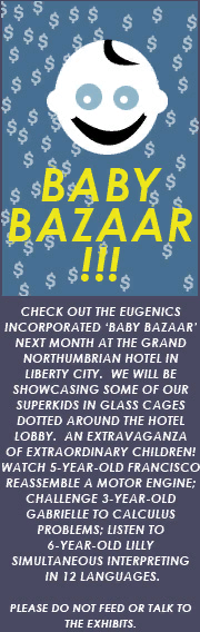 For people who like to bang kin, to keep reproduction in the family - like the British monarchy, and much of the South, and all American blueblood families - Eugenics is a great way to ensure that Billy-Joe does not end up with long arms and a head like a half-eaten empanada. However, at Eugenics Incorporated, there is no such thing as a genetic defect. The customer is always right. If you want a bald dwarf or a hermaphrodite with webbed feet, that is your prerogative. We believe in consumer choice. You pick out a particular breed of dog based on your preference and lifestyle so why shouldn't you be able to purchase a made-to-order baby? Would you buy an Irish Wolfhound if you lived in a studio apartment? You choose your biological partner based on intellect, personality and appearance. Why not pre-select these characteristics for your child from a glossy catalogue? Eugenics is no different from a sex change, nose job or stomach staple. We just get all the surgery out of the way before the kid is born. You're not perfect but your child can be. Overcompensate for your own inadequacies by living vicariously through your off-the-shelf offspring. Make sure your successor succeeds.