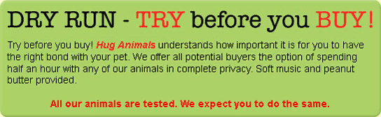 Pets make you feel good about yourself. They don't judge your flabby thighs or receding hairline. They don't have sudden headaches and they are always in the mood to play. They don't answer back and, no matter what you do to them, they still love you afterwards. And they will lick peanut butter no matter where you put it. With an animal, you get out what you put in. Companionship, loyalty, subservience, girth... everybody looks for something different in a soul-mate. From large dogs to small rodents... from farmyard animals to exotic imports... we will work to find the best match for you. | At Hug Animals, we believe in spending quality, one-on-one time with all our animals. In short, we teach them how to love again. We teach them to do what's natural - what they are hard-wired to do... just like you. It is this uniquely intimate approach to animal re-conditioning that makes our pets so sensitive to the needs of their new owners. |  |