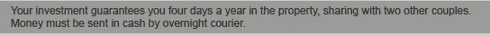 | Have you ever dreamt of owning a second home? How about owning a second home for one week out of the year with a bunch of strangers who probably shit on the carpet? Can you imagine being able to escape to a pied-à-terre for romantic weekend getaways? Do you even know what a pied-à-terre is? Who really gives a shit? Timeshares are never a regretful decision. Leftover Vacations is giving you the chance to share in an incredible investment property, located in the beautiful city of Detroit, Michigan. We will provide transportation and airfare for you to come see it. After a great presentation and use of an ether soaked rag, you will wake up having signed some great contracts. Just think, for a one-time payment of only $20,000, you could have limited access to an inner-city studio apartment in America's murder capital for the rest of your life! Sign up for this exclusive offer today and we will give you a boat! |