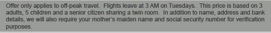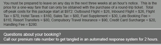You have been selected to join our exclusive Travel Club! Enjoy special discounts, amazing offers and unique package deals all for the low promotional rate of $2,000 per year! A telemarketer will call you every 10 minutes for the rest of your life! Be an adventurer! |