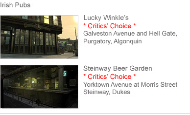 Irish pubs are everywhere. It's amazing that there are any Irish left in Ireland. First they opened up bars throughout continental Europe so that the British could binge-drink when they went abroad without having to mix with the locals. Then they started their assault on America. The Americans love to claim distant Irish relatives from 11 generations ago so that they can get loaded like every day is St. Patrick's Day. These days you can go to the most remote Amazonian settlement and still find an Irish pub nestled between a Wigwam Burger and Bean Machine Coffee, with a bartender who has a horrible accent. Not that it's exactly difficult to open one. A wooden floor, some green paint, a few olde-world artifacts, a couple of shamrocks, a CD of depressing folk songs about murdering your family, some meaningless words in Gaelic, Blarney's on tap, a stupid name like Stinky O'Muff's and you're in business. If you want the real deal in Liberty City - a bar where people still punch first and ask questions second - you should check out Lucky Winkle's in Purgatory, a place that seems to have been on the corner of Galveston and Hell Gate since the dawn of time. Another of our favorites is the historic Steinway Beer Garden in Dukes, the perfect spot to hide from your probation officer for an afternoon. Get in there, get drunk and get into a fight. Make the Emerald Isle proud your ancestors left and never came back! |