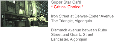 Founded by a handful of annoying Brits who realized Americans love to buy T-shirts for places where they've eaten chicken wings and gotten drunk, the Super Star Café is a famous chain of bar-restaurants that has spread around the world. Wherever there are merchandise-collecting tourists in the world, a Super Star Café will not be too far away. People love their Super Star t-shirts and wear them like a badge of honor when they get home, convinced that everybody will think that they are living on the edge, partying with the rich and famous. Liberty City boasts two of these theme restaurants with their swanky interiors, high ceilings, comfy chairs and split-level seating areas. If you like American comfort food, loud music and video games, expensive, watered-down drinks and being served by an overly-chatty failed actor, you should definitely check out the Super Star Café in Lancaster or The Triangle. If nothing else, they are great places to pick up drunken Europeans. |