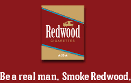 | Yes. Hundreds of thousands of people died last year from smoking. The other 100 million smokers are doing just fine. What brand you smoke is crucial to your lifestyle. No true man would smoke an Athena, even if he was drunk. Redwood cigarettes are the essence of masculinity. Women love a man with a yellow moustache and skin like leather. The Redwood Man doesn't back out of a fight, cry during movies or ejaculate prematurely. The Redwood Man doesn't listen to doctors. The Redwood Man doesn't even go to doctors. The Redwood Man nods slowly at the girl across the way, taking a drag on his cigarette and letting the smoke roll off his tongue. He begins to walk towards the dusk, the sounds of the city fading behind him as he returns to the wilderness where he belongs. He feels a tap on his shoulder. He turns slowly, his boot scuffing the sidewalk. It's her. She smiles and unzips his pants. He is a man. She is a woman on her knees. This is Redwood Country. How can something be wrong if it feels so right? Be a real man. Smoke Redwood.* (*Of course, we recommend you follow doctors' orders and stop smoking and being a man, but in case you like to make up your own mind, smoke Redwood). | ![]() | ||